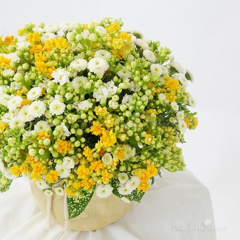 Sản phẩm gồm: - Sống Đời vàng – 5 cành - Sống Đời trắng – 5 cành - Calimero trắng – 10 cành - Lá Trúc đốm – 1 bó - Chậu gốm có nơ - Foam