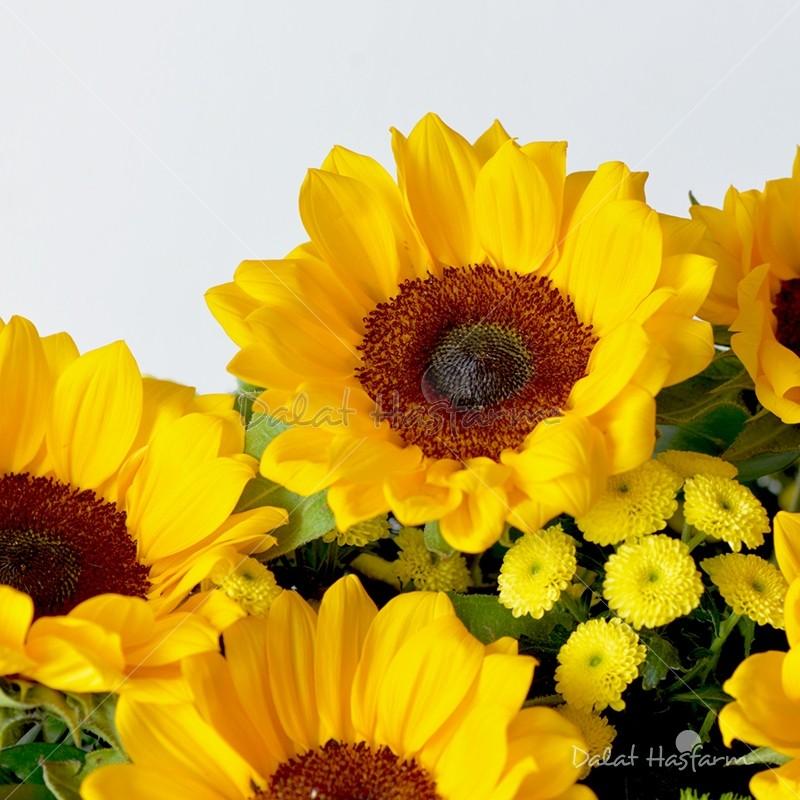 Giỏ hoa gồm: - Hướng dương: 5 cành - Các loại hoa phụ khác: Calimero, Green Wicky, Lá Chanh, Dương Xỉ - Giỏ mây