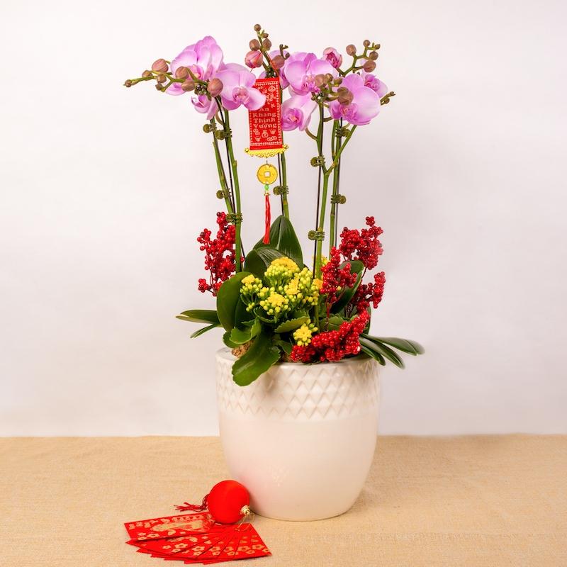 Sản phẩm bao gồm: Chậu sứ: 1 cái Lan trung: 5 cây Sống đời mini kép: 1 chậu Phụ liệu trang trí: 1 set